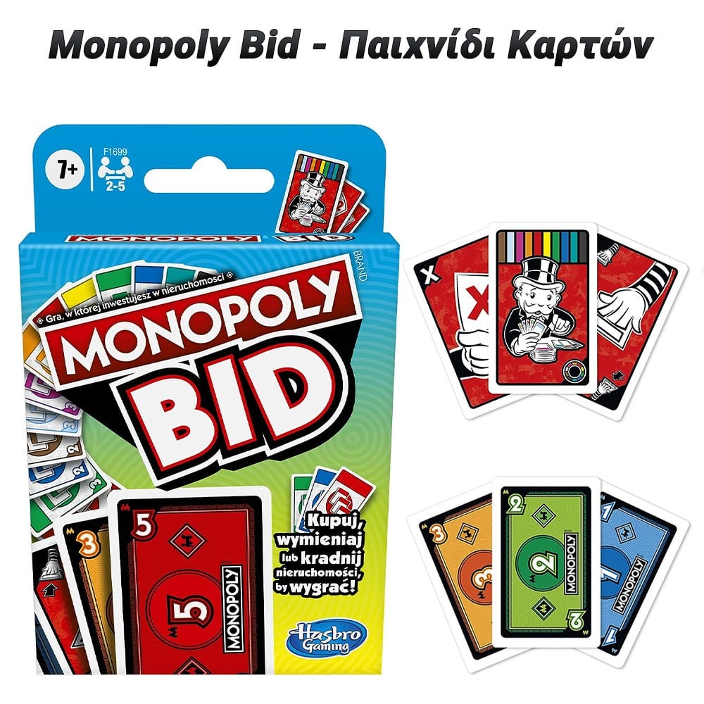 Παίζεται σε γύρους, όπου όλοι έχουν την ευκαιρία να διοργανώσουν μια δημοπρασία. Όταν έρθει η στιγμή να κάνουν προσφορά για ένα ακίνητο, οι παίκτες διαλέγουν πόσα χρήματα θέλουν να ποντάρουν. Μετά, όλοι αρχίζουν να φωνάζουν «1, 2, 3, ποντάρω!» και αφήνουν κάτω τις κάρτες χρημάτων τους. Ο παίκτης που προσφέρει τα περισσότερα χρήματα κερδίζει το ακίνητο. Συγκεντρώστε 3 ακίνητα για να κερδίσετε!Το παιχνίδι Monopoly Bid είναι μια καταπληκτική επιλογή για μια βραδιά παιχνιδιού, για πάρτυ και για δραστηριότητες μέσα στο σπίτι.