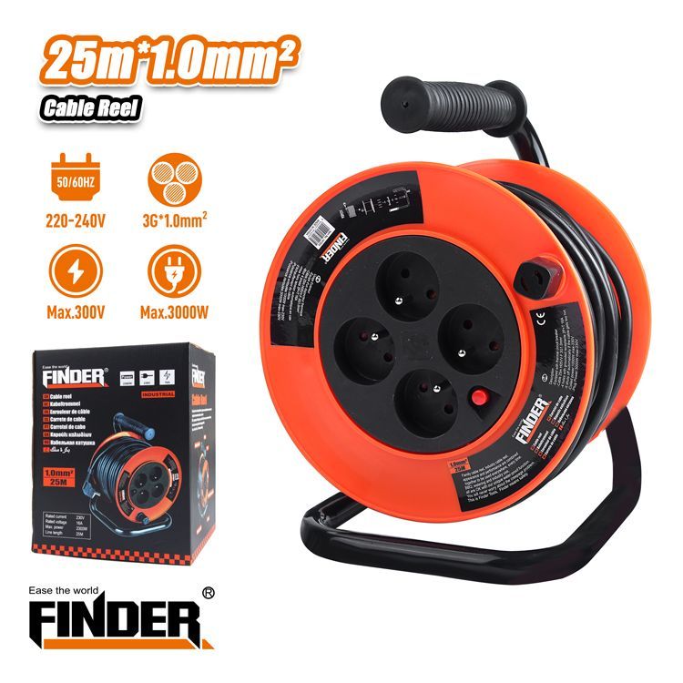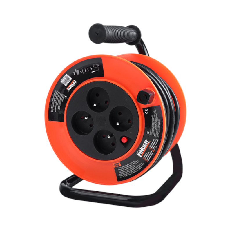 Πρακτικό φορητό στροφείο ανοικτού τύπου της FINDER, με καλώδιο ρεύματος 25 μέτρων για να χρησιμοποιείς τις ηλεκτρικές συσκευές σου από απόσταση. Διαθέτει 4 πρίζες σούκο ασφαλείας, εργονομική, αντιολισθητική λαβή για εύκολη μεταφορά και λαβή περιστροφής.