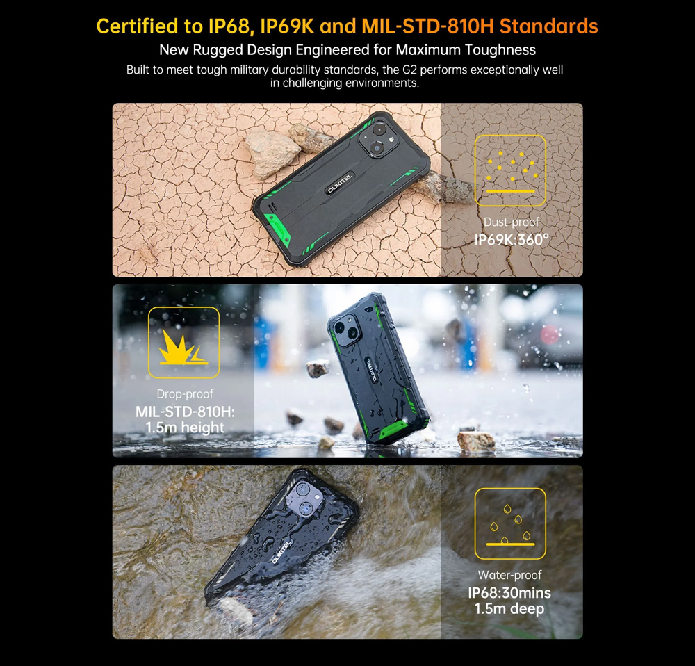 Με πιστοποίηση IP68/IP69K και πρότυπο MIL-STD-810H, το G2 είναι σχεδιασμένο για να αντέχει σε ακραίες συνθήκες χρήσης και περιβάλλοντα.