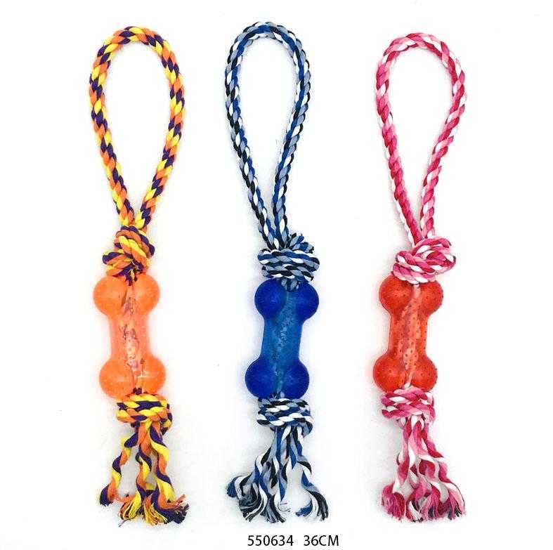 Παιχνίδι σκύλου κόκκαλο μασητικό από ανθεκτικό, ελαστικό, μη τοξικό TPR, με σχοινί με κόμπους και λαβή, συνολικού μήκους 36cm. Φροντίζει την υγεία τον δοντιών του σκύλου σας διατηρώντας τα καθαρά και μειώνοντας την πέτρα, ενώ παράλληλα διασκεδάζει παίζοντας.