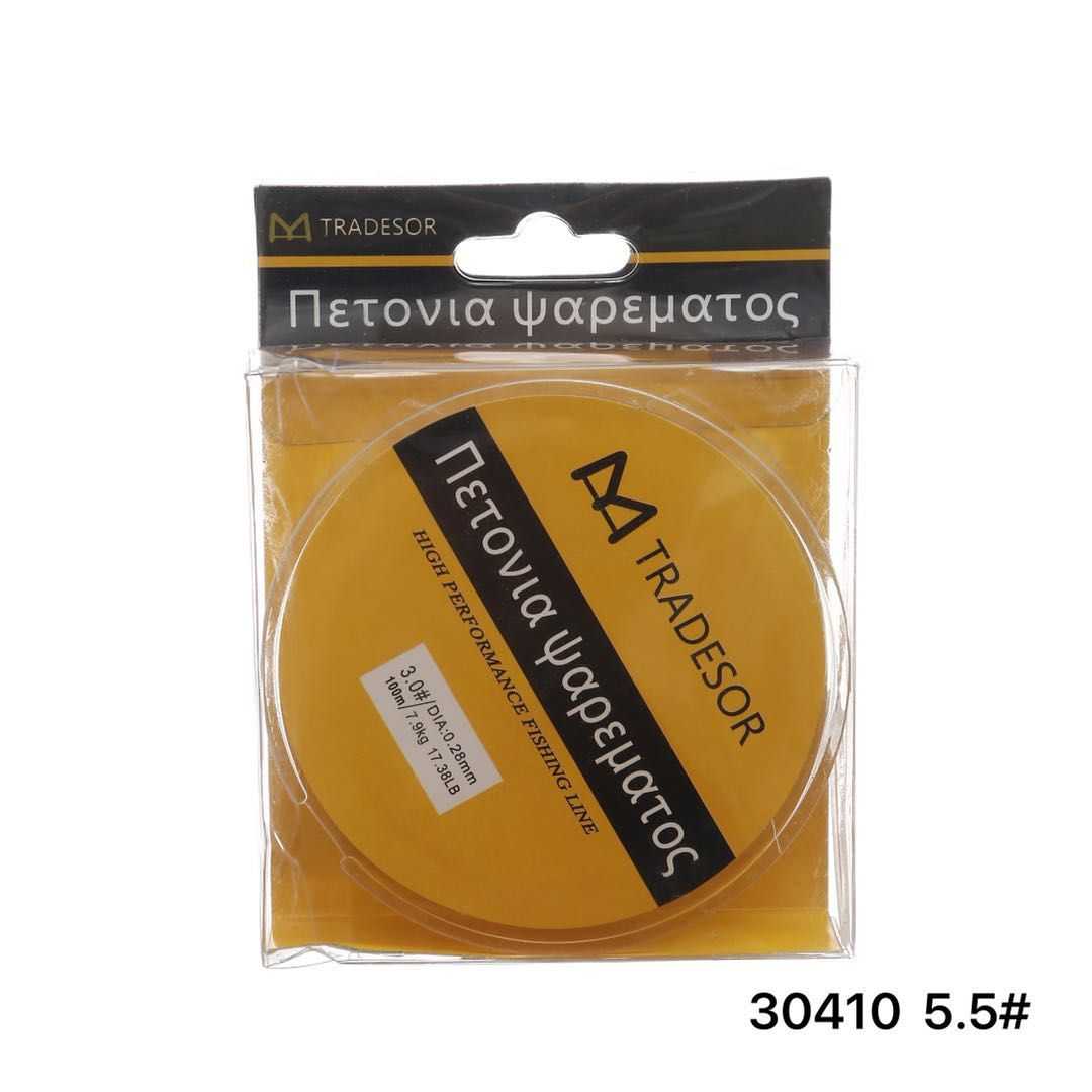 Η Tradesor, βάσει της υψηλής τεχνογνωσίας και του τεχνολογικού εξοπλισμού που χρησιμοποιεί, έχει κατασκευάσει μια σειρά από πετονιές ψαρέματος υψηλής ποιότητας και αντοχής. Ο τρόπος με τον οποίο έχουν σχεδιαστεί εξασφαλίζει στην πετονιά μηδενική μνήμη, ταχεία βύθιση και συνάμα την κάνει εξαιρετικά μαλακή παρά την μεγάλη αντοχή της. Είναι 100% αόρατη με μεγάλες αντοχές στον κόμπο και στα γδαρσίματα. Μέγεθος: 5.5#