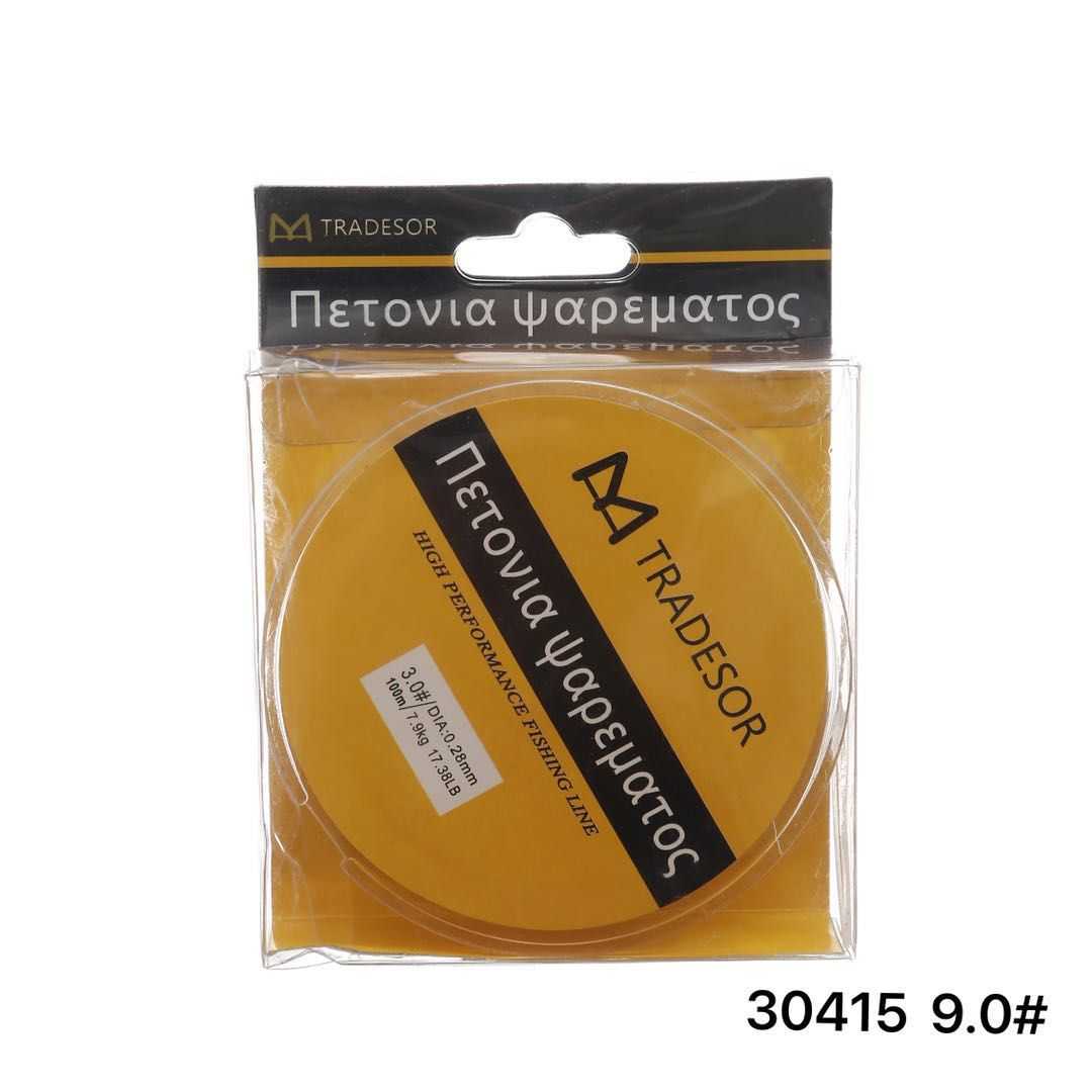 Η Tradesor, βάσει της υψηλής τεχνογνωσίας και του τεχνολογικού εξοπλισμού που χρησιμοποιεί, έχει κατασκευάσει μια σειρά από πετονιές ψαρέματος υψηλής ποιότητας και αντοχής. Ο τρόπος με τον οποίο έχουν σχεδιαστεί εξασφαλίζει στην πετονιά μηδενική μνήμη, ταχεία βύθιση και συνάμα την κάνει εξαιρετικά μαλακή παρά την μεγάλη αντοχή της. Είναι 100% αόρατη με μεγάλες αντοχές στον κόμπο και στα γδαρσίματα. Μέγεθος: 100m/#9.0