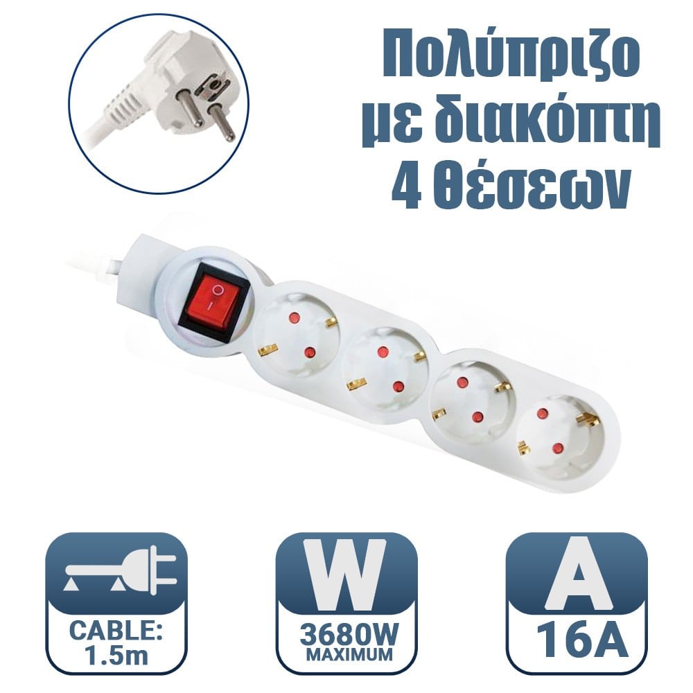 Πολύπριζο 4 Θέσεων με Καλώδιο 1.5m και Προστασία Επαφών