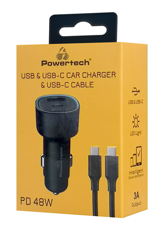 Υψηλής απόδοσης φορτιστής αυτοκινήτου της Powertech, συμβατός με συσκευές που φορτίζουν μέσω θύρας USB. Διαθέτει USB και USB-C θύρες εξόδου που υποστηρίζουν φόρτιση με μέγιστη συνολική απόδοση 48W.