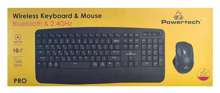 Set περιφερειακών της Powertech που αποτελείται από ασύρματο πληκτρολόγιο και ασύρματο οπτικό ποντίκι. Είναι συμβατά με συσκευές όπως desktop, laptop, tablet κ.λπ.