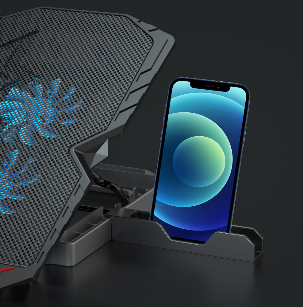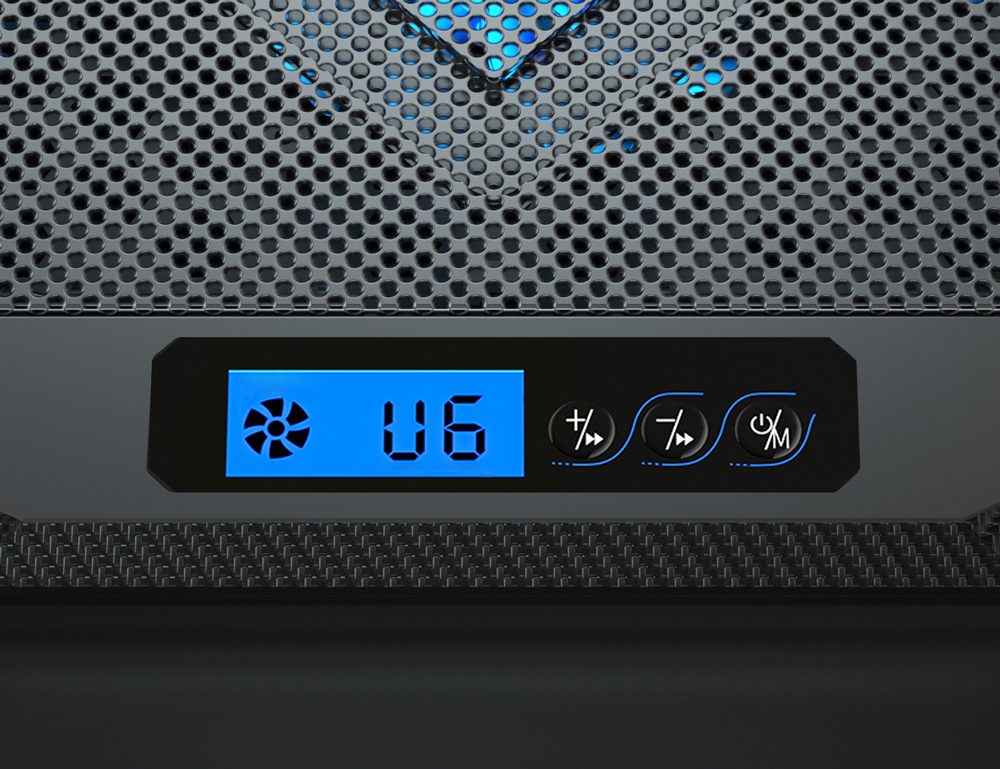 Εξοπλίζεται με LCD οθόνη και πλήκτρα για την ρύθμιση ταχύτητας των ανεμιστήρων και διαθέτει stand για το κινητό σας τηλέφωνο.
