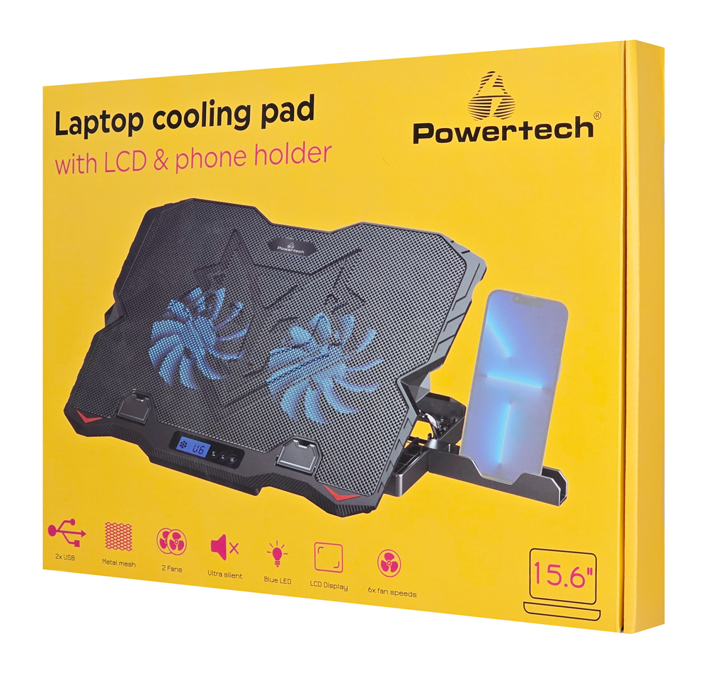 POWERTECH βάση & ψύξη laptop PT-1346, έως 15.6″, 2x 125mm LED fan, μαύρη