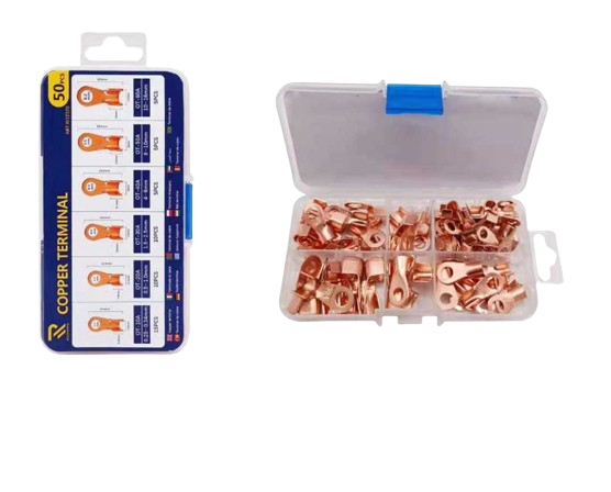 Aκροδέκτες καλωδίων χάλκινοι, 6 διαφορετικών μεγεθών, σε πρακτική κασετίνα με διαχωριστικά. Σετ 50 τεμαχίων.