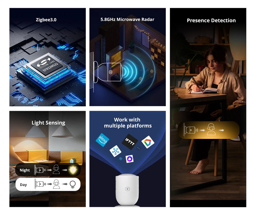 Ο ανιχνευτή κίνησης SNZB-06P μπορεί να αισθανθεί την παρουσία σας στον χώρο και να ενεργοποιήσει τον φωτισμό, διατηρώντας τον ανοιχτό μέχρι να φύγετε από τον χώρο. Επιπλέον, χάρη στον αισθητήρα φωτός που ενσωματώνει, η ενεργοποίηση του φωτισμού γίνεται μόνο κατά την διάρκεια της νύχτας.