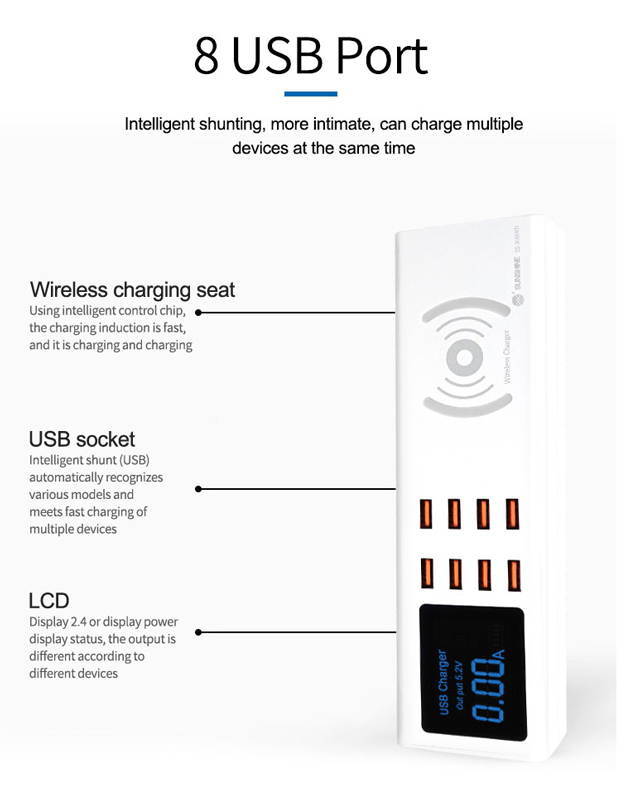 Σταθμός φόρτισης με 8x θύρες USB, για ταυτόχρονη φόρτιση έως 8 συσκευών, με μέγιστη απόδοση 8A. Διαθέτει οθόνη για την ένδειξη της απόδοσης φόρτισης και υποστηρίζει ασύρματη φόρτιση με απόδοση έως 10W.
