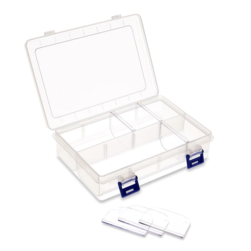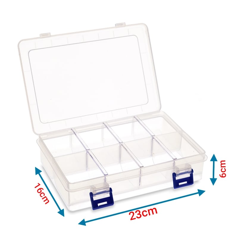 Πλαστικό κουτί οργάνωσης και αποθήκευσης, με 2-8 θέσεις. Με διάφανο καπάκι για εύκολη αναγνώριση του περιεχομένου.Πρακτικός τρόπος κλεισίματος που σφραγίζει με κλιπ.