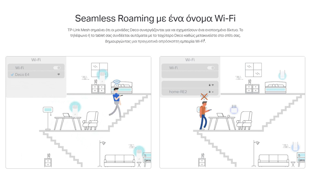 -Με την προηγμένη τεχνολογία Deco Mesh, οι μονάδες συνεργάζονται για να σχηματίσουν ένα ενοποιημένο δίκτυο με ένα μόνο όνομα δικτύου. Οι συσκευές αλλάζουν αυτόματα μεταξύ Decos καθώς μετακινείστε στο σπίτι σας για τις γρηγορότερες δυνατές ταχύτητες.