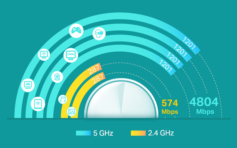 -WiFi Speeds: AX5400 / 5 GHz: 4804 Mbps (802.11ax), 2.4 GHz: 574 Mbps (802.11ax)
