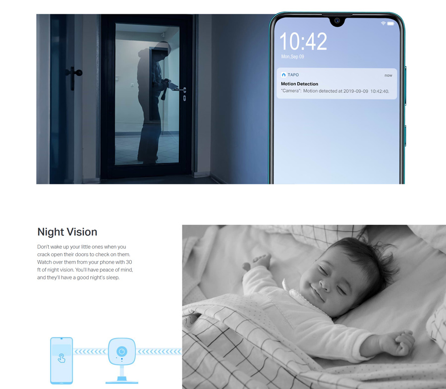 Υποστηρίζει την τεχνολογία Motion Detection και Notifications, με την οποία ανιχνεύει κάθε κίνηση και ειδοποιεί με μήνυμα. Εξοπλίζεται με ηχείο και μικρόφωνο, επιτρέποντας την αμφίδρομη επικοινωνία με τα άτομα που βρίσκονται στον χώρο και έχει λειτουργία εκφοβισμού ανεπιθύμητων επισκετών με φως και ήχο.