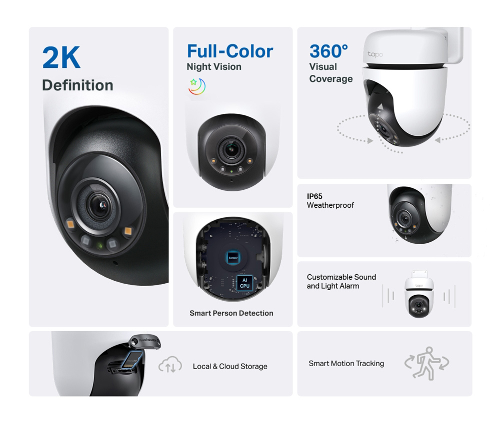 Smart κάμερα εξωτερικού χώρου της TP-Link με εικόνα ανάλυσης 2K και ενσωματωμένο μικρόφωνο και ηχείο που επιτρέπει την αμφίδρομη μεταφορά φωνής και ήχου.