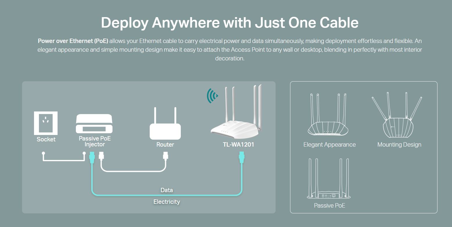 Το TL-WA1201 είναι ένα πολυχρηστικό access point κατάλληλο για την δικτύωση σπιτιών και μικρών επιχειρήσεων. Με πολλαπλές κεραίες και Dual Band Wi-Fi παρέχει εξαιρετικές ταχύτητες και δυνατό σήμα ακόμη και σε δυσπρόσιτα σημεία του χώρου. Υποστηρίζει συχνότητες 5GHZ και 2.4GHZ με ταχύτητες μέχρι και 867 Mbps και 300 Mbps αντίστοιχα. Η τεχνολογία MU-MIMO δίνει την δυνατότητα στο access point να διαμοιράζει το σήμα ταυτόχρονα σε πολλές συσκευές χωρίς καθυστερήσεις ενώ η θύρα Gigabit επιτρέπει σε διασύνδεση με υψηλές ταχύτητες. Το access point μπορεί να λειτουργήσει και με πολλαπλές επιπλέον λειτουργίες όπως range entender mode, client mode και Multi-SSID mode. Υποστηριζεται η τεχνολογία PoE η οποία μπορεί να τροφοδοτήσει το access point με το απαραίτητο ρεύμα μέσω του ethernet καλωδίου σύνδεσης, περιορίζοντας έτσι τα καλώδια κατά την τοποθέτηση. Το λογισμικό Captive Portal Marketing επιτρέπει στον ειδικό σχεδιασμό σελίδας για την είσοδο των “guests” στο δίκτυο της επιχείρησης, παρέχοντας την δυνατότητα για διαφήμιση ή ενημέρωση τους μέσω αυτού. Η τεχνολογία Beamforming εξασφαλίζει ότι θα δίνετε δυνατό σήμα ακριβώς στην περιοχή που χρειάζεται περισσότερο κατά μήκος του χώρου.