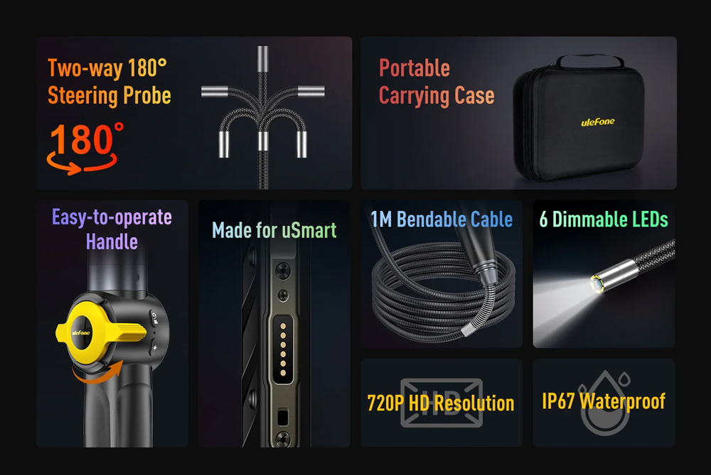 Ενδοσκοπική κάμερα, κατάλληλη για smartphone με uSmart βύσμα επέκτασης της ULEFONE. Είναι εξαιρετική για προβολή εικόνας σε μέρη που είναι δύσκολα προσβάσιμα, όπως για παράδειγμα εντός σωληνώσεων, συστημάτων εξαερισμού κλπ.