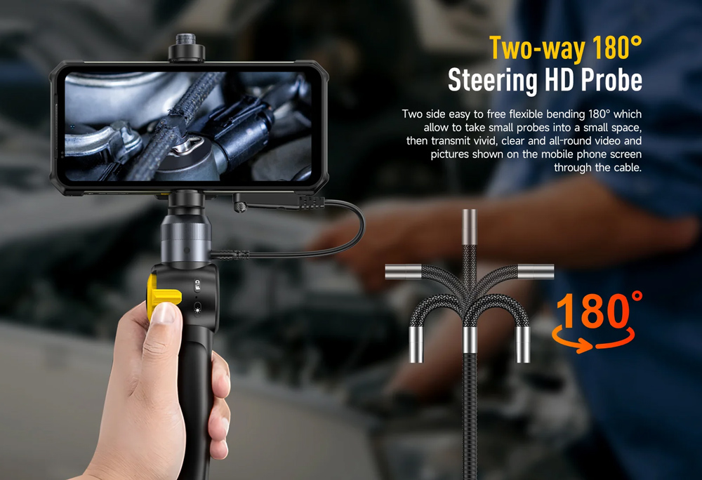 Διαθέτει κάμερα ανάλυσης 1MP, 6 ρυθμιζόμενα LED και σκληρό καλώδιο μήκους 1 μέτρου που μπορεί να εισχωρεί αποτελεσματικά χωρίς να σκαλώνει. Επιπλέον, εξοπλίζεται με βολική λαβή που διαθέτει βάση για το smartphone, διευκολύνοντας την προβολή της καταγραφής της κάμερας.