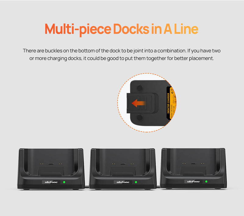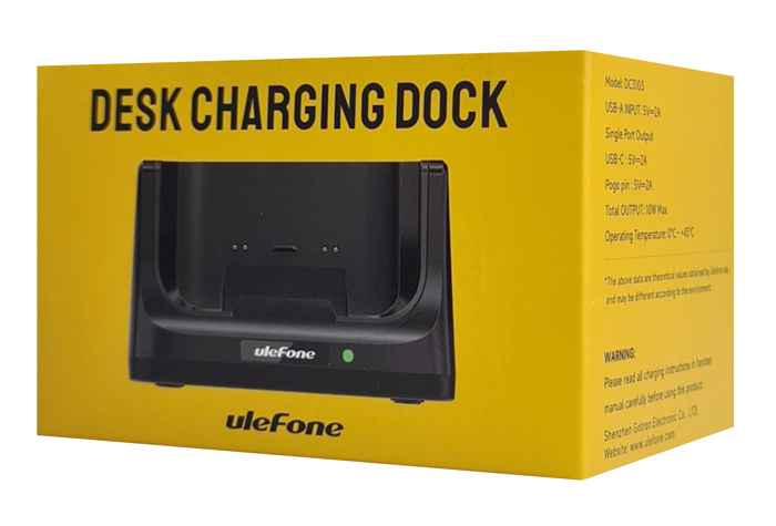 Επιτραπέζια βάση φόρτισης από την Ulefone, συμβατή με τα smartphone της σειράς Power Armor 16. Φορτίζει την συσκευή σας ασύρματα μέσω των επαφών Pogo Pin με μέγιστη απόδοση 10W. Επιπλέον, στο πίσω μέρος της διαθέτει έξοδο USB που σας επιτρέπει να φορτίζετε παράλληλα ακόμη μια συσκευή η όποια φορτίζει μέσω θύρας USB.