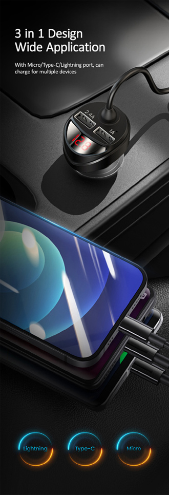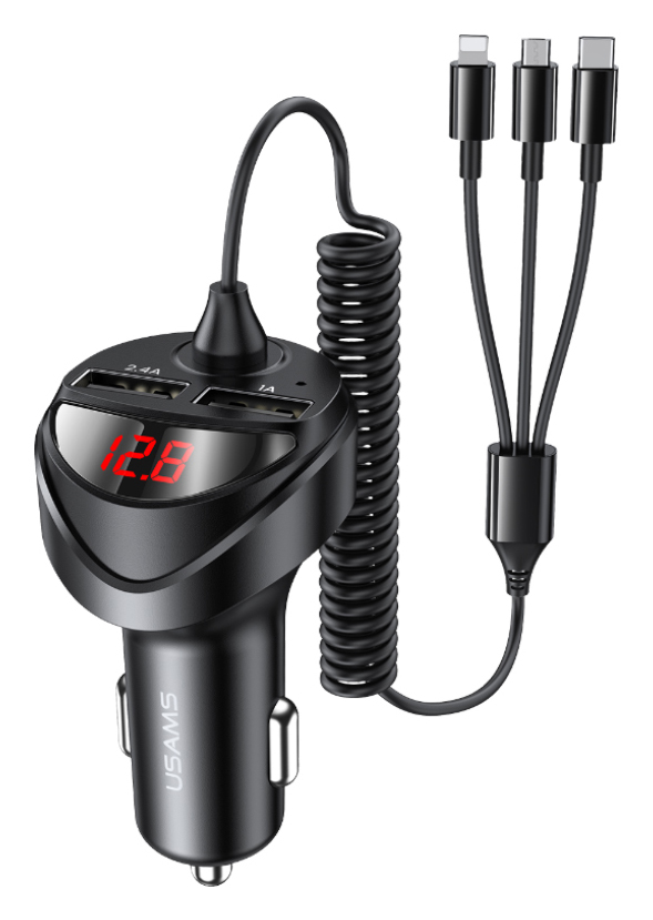 USAMS φορτιστής αυτοκινήτου C22 με καλώδιο 3 σε 1 & οθόνη, 3.4A, μαύρος