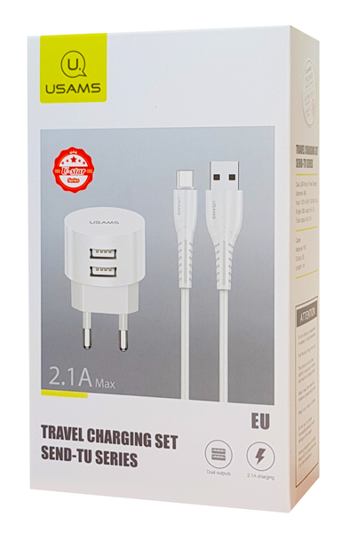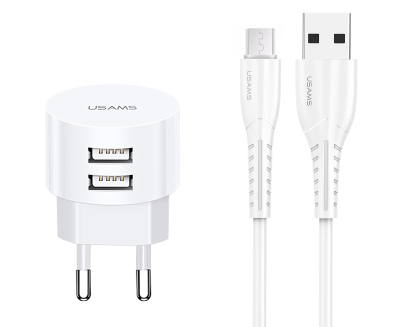 USAMS φορτιστής τοίχου T20 & καλώδιο Micro USB, 2x USB, 2.1A, λευκός