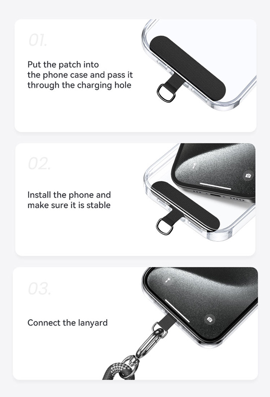 Είναι ρυθμιζόμενο και αποτελείται από 2 μέρη, το κορδόνι και ένα υφασμάτινο κομμάτι το οποίο τοποθετείται στο εσωτερικό της θήκης του κινητού, επιτρέποντας το κρέμασμα του από τον γάντζο του κορδονιού.
