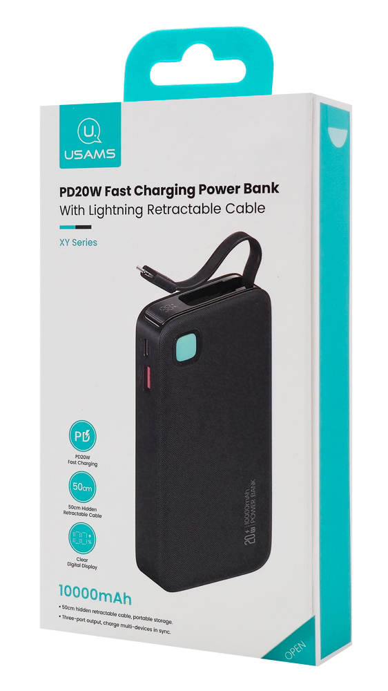 USAMS power bank CD225 με καλώδιο Lightning, 2x θύρες εξόδου, 10000mAh, 20W, μαύρο