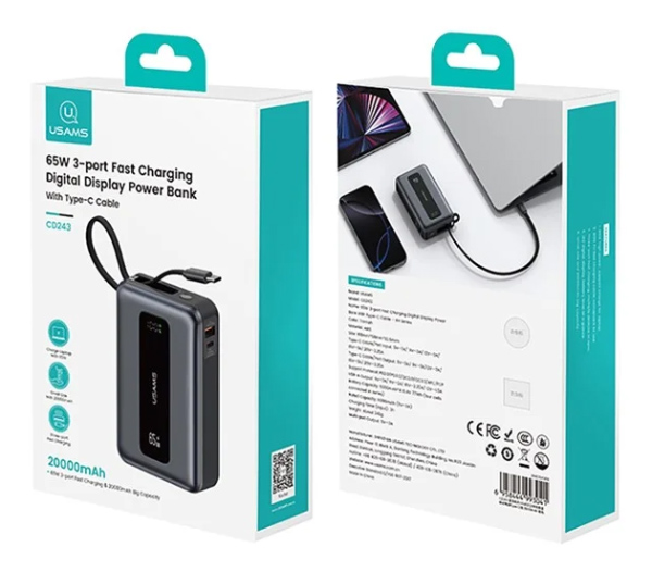 USAMS power bank CD243 με καλώδιο USB-C, 2x θύρες εξόδου, 20000mAh, 65W, γκρι