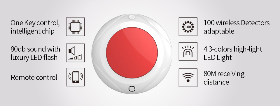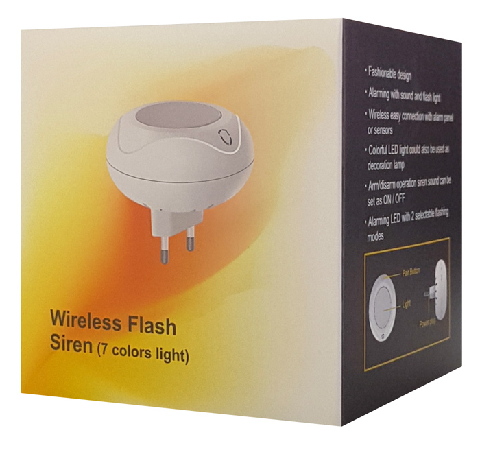 Ασύρματη σειρήνα εσωτερικού χώρου της Wolf Guard με ηχητικό και οπτικό συναγερμό LED φωτός 7 διαφορετικών χρωμάτων και 2 διαφορετικών λειτουργιών. Χάρη στη μοντέρνα σχεδιάσει του και την μεγάλη γκάμα χρωμάτων LED, μπορεί να χρησιμοποιηθεί ως φως διακόσμησης.
